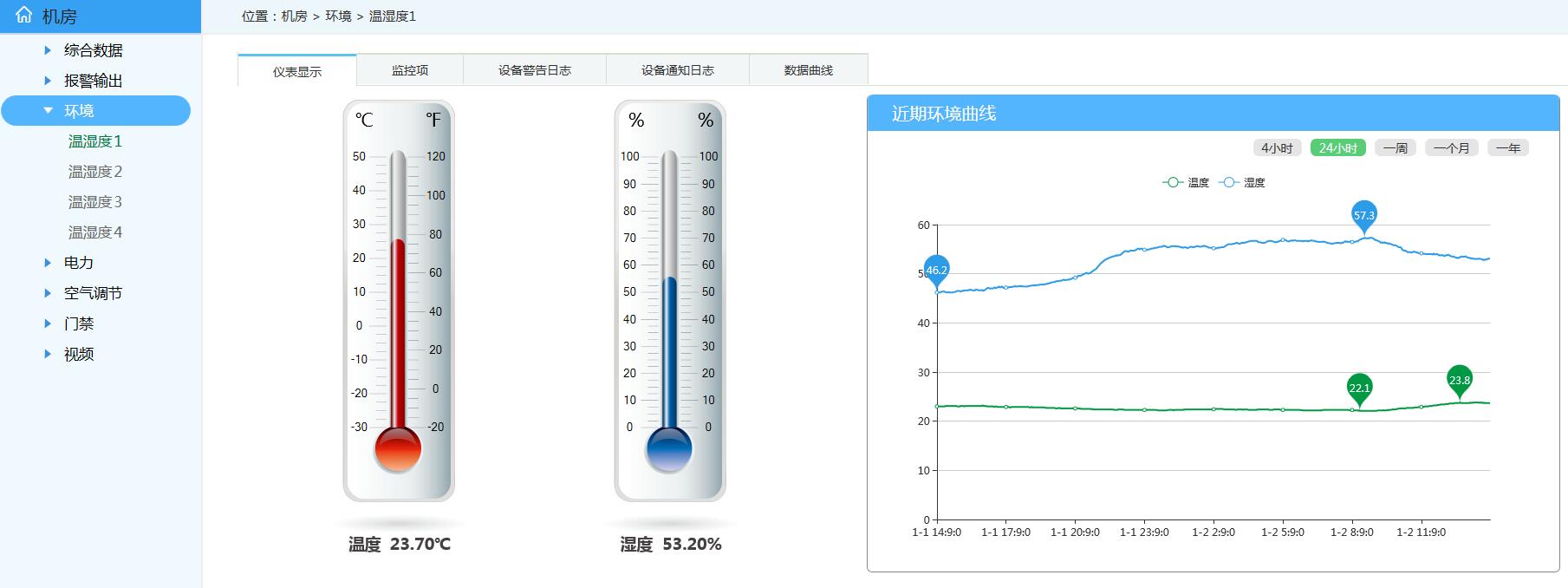客戶需求:機房內精密空調監測,水浸監測,溫濕度監測;配電房蓄電池溫度、內阻、電壓、電流監測,UPS電流電壓功率因素等參數實時監測;消防系統、門禁系統視頻接入到動環系統。